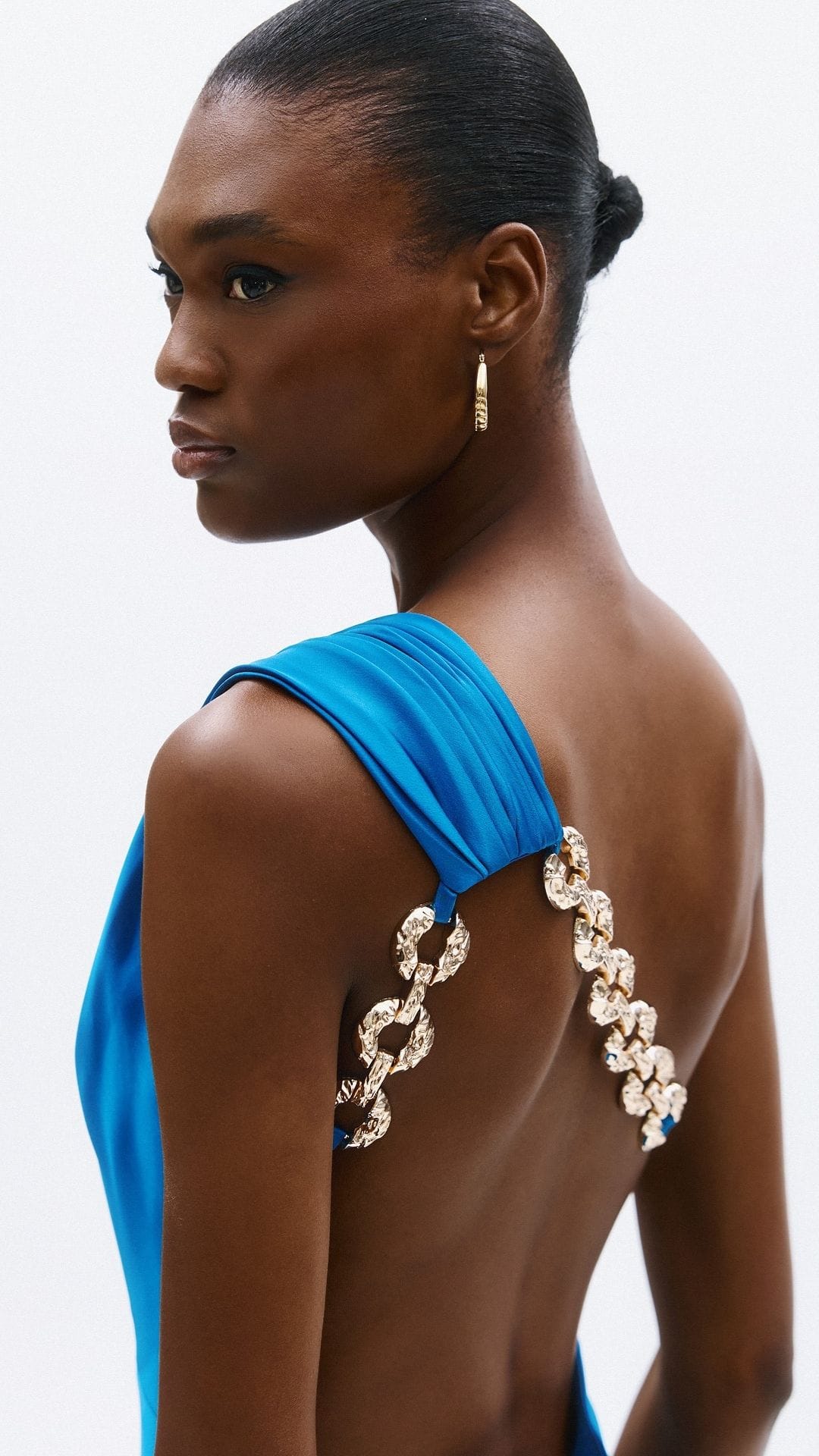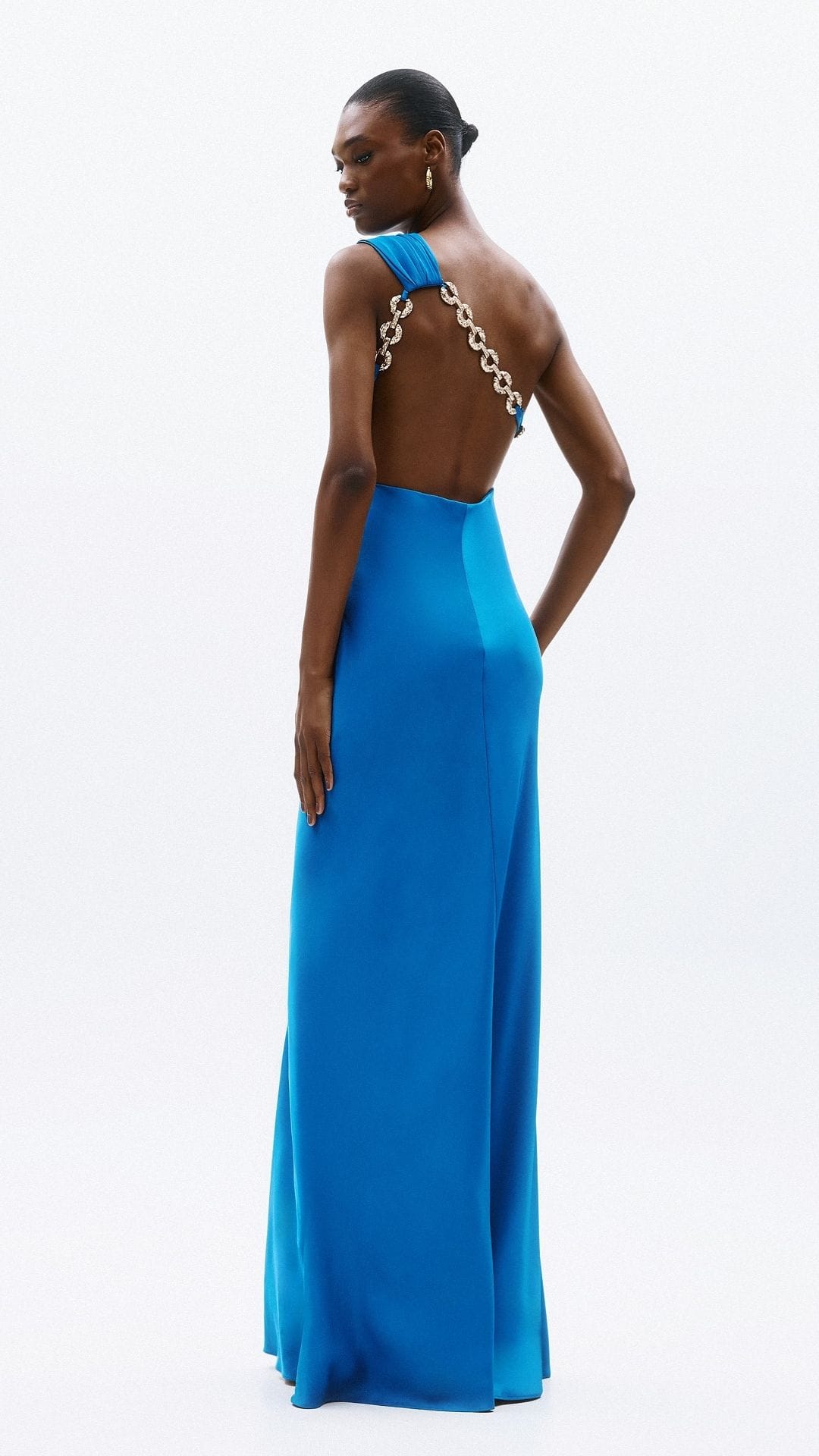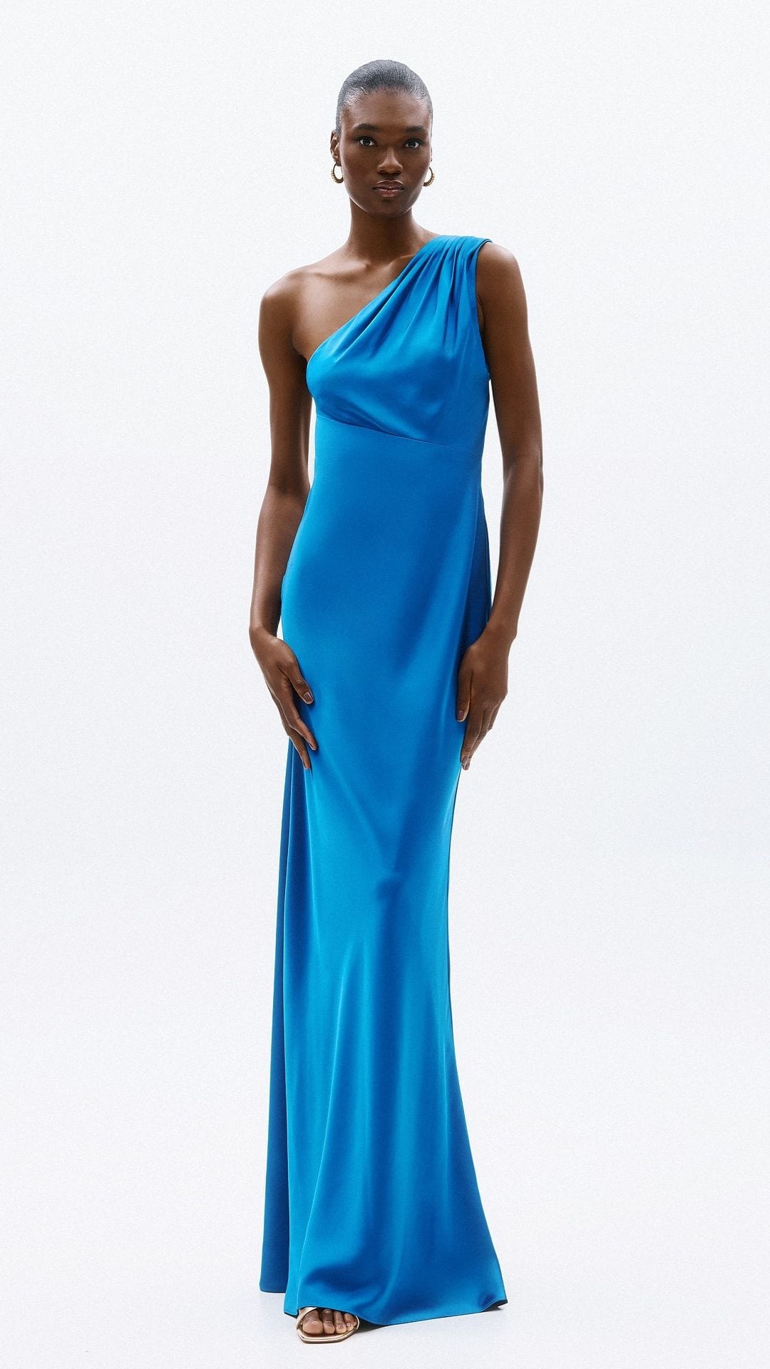 Abito da Cerimonia Allure 02: romantico abito da cerimonia A-line mono spalla e dettagli preziosi sul retro.
