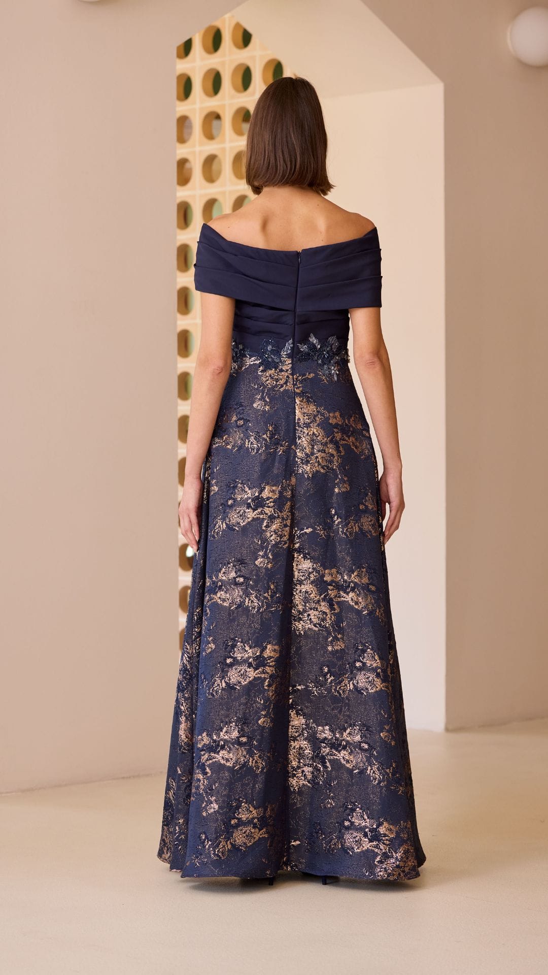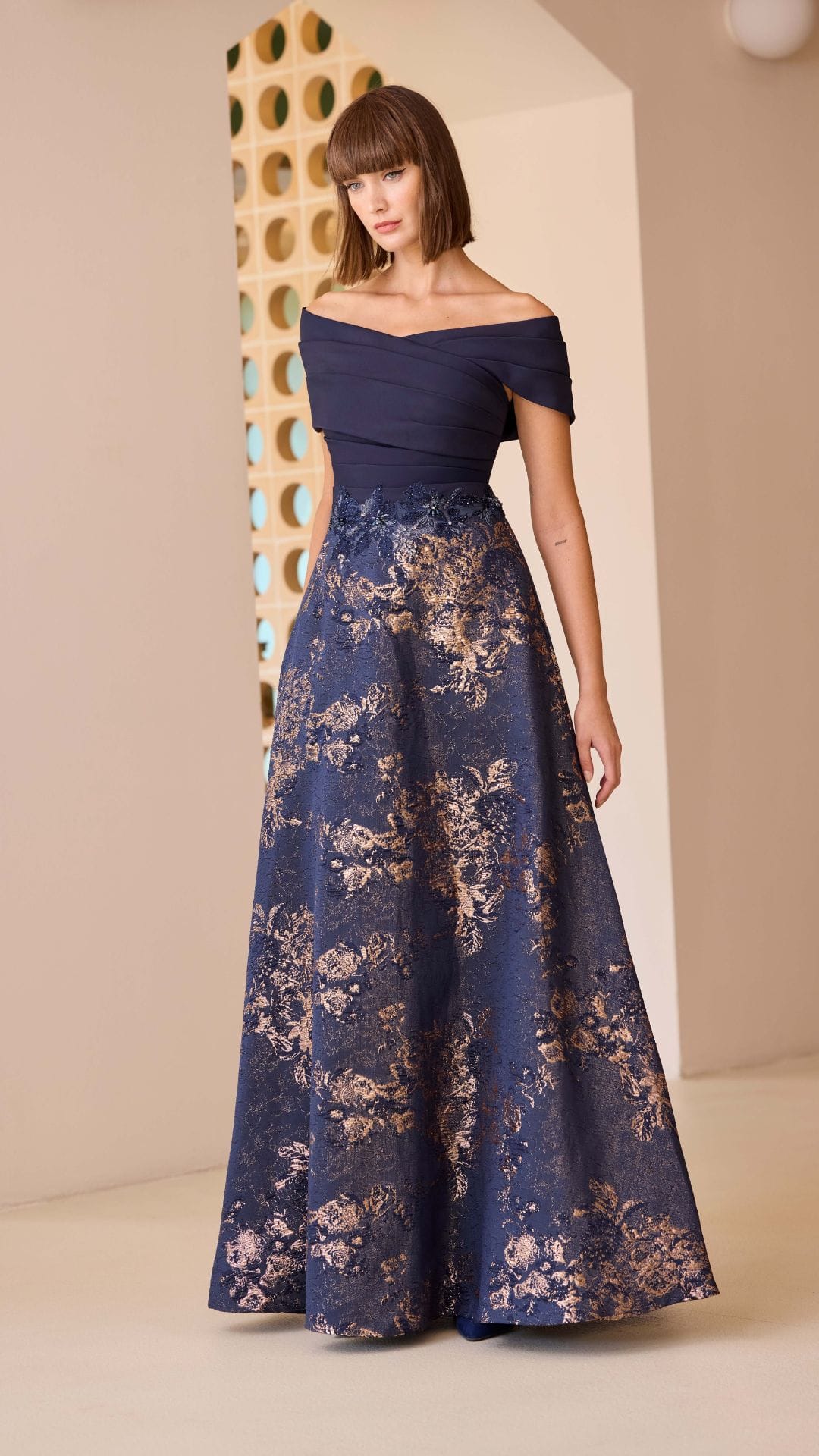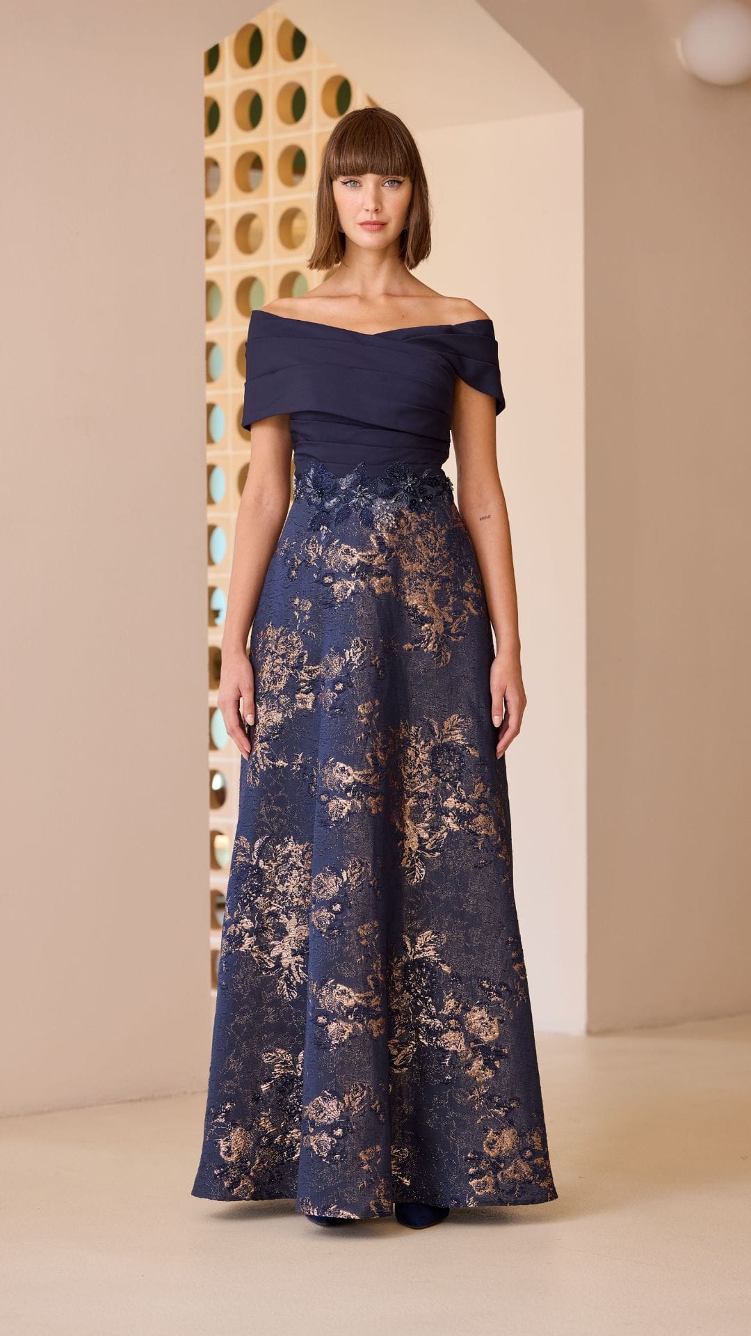Abito da cerimonia Carla Ruiz 02: romantico abito da cerimonia con scollatura omerale e dettagli ricamati.