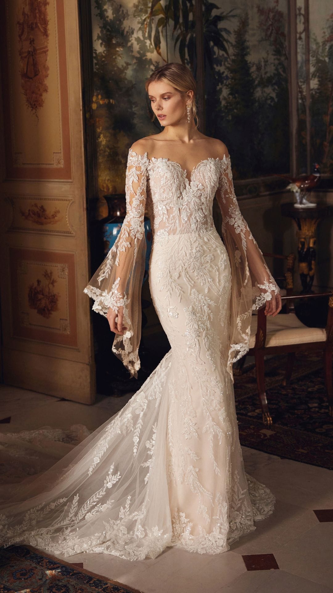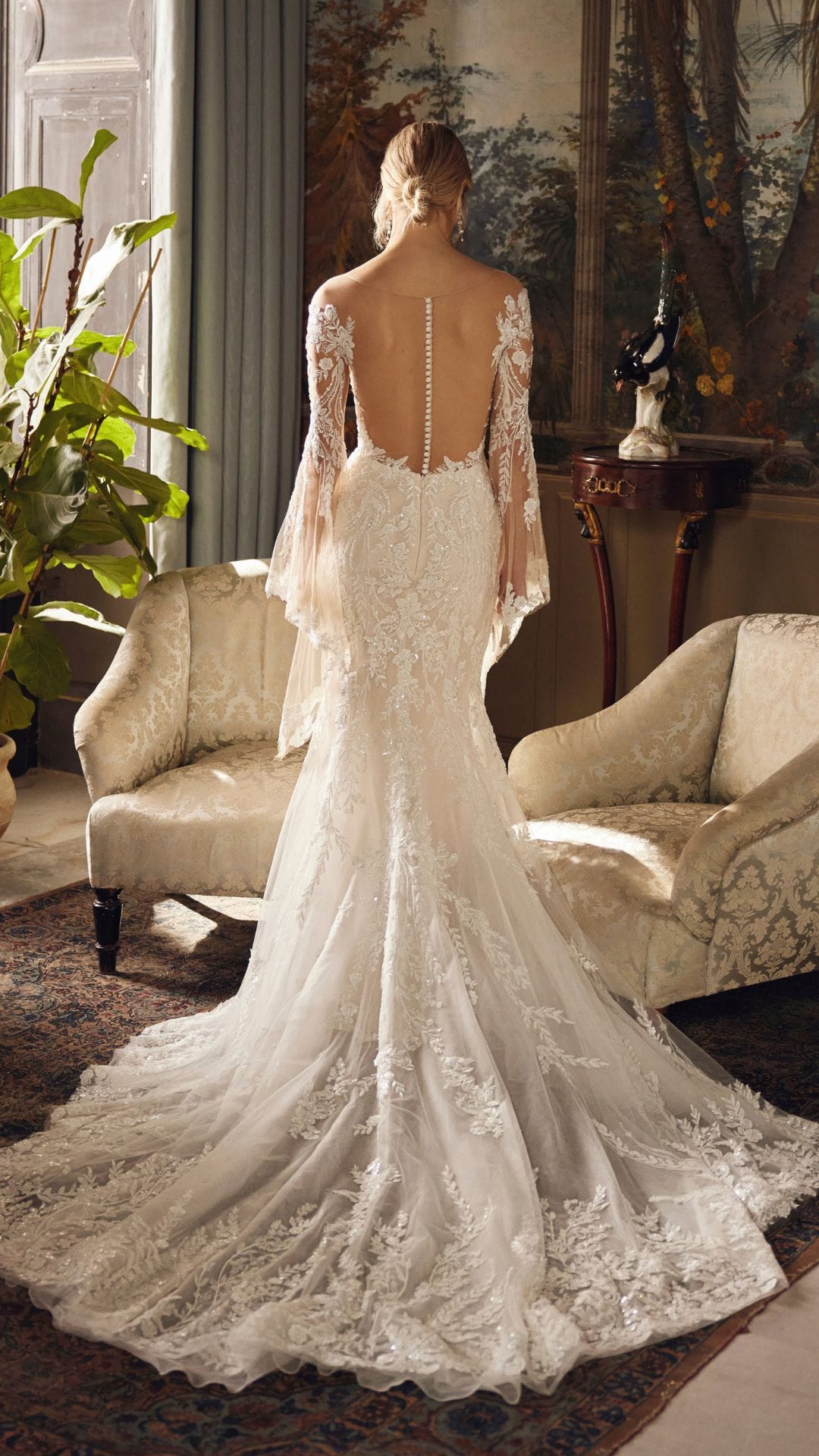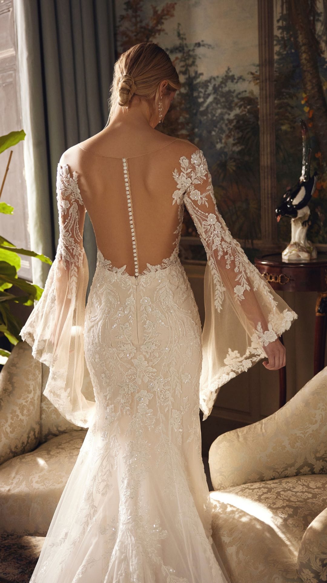 Abito da sposa Demetrios 04: La raffinatezza boho brilla in questo stile da sogno, con maniche a campana fluenti che portano un tocco romantico alla silhouette aderente. Il fascino bohémien dell’abito e il fascino sofisticato sono esaltati da abbellimenti di pizzo con perline, aggiungendo il design lussuoso per esaltarne la bellezza.