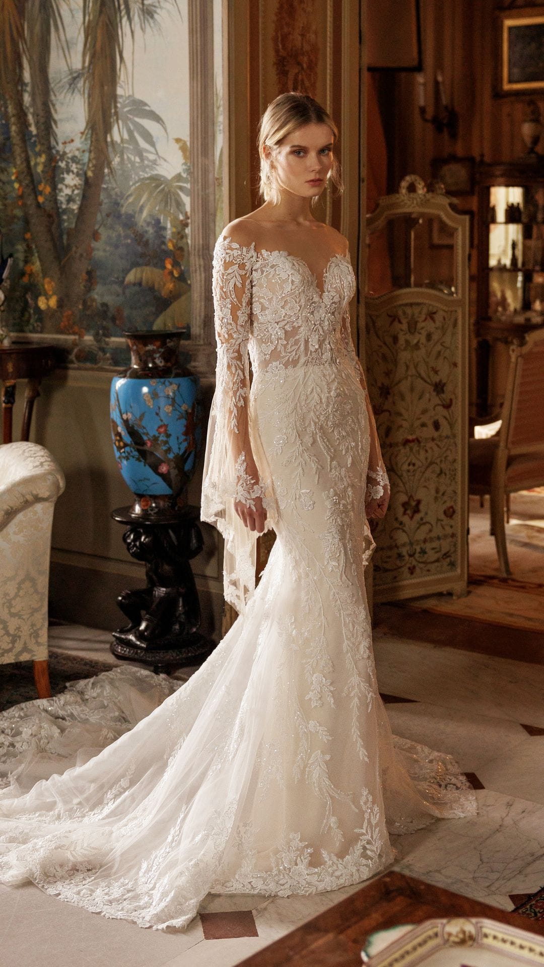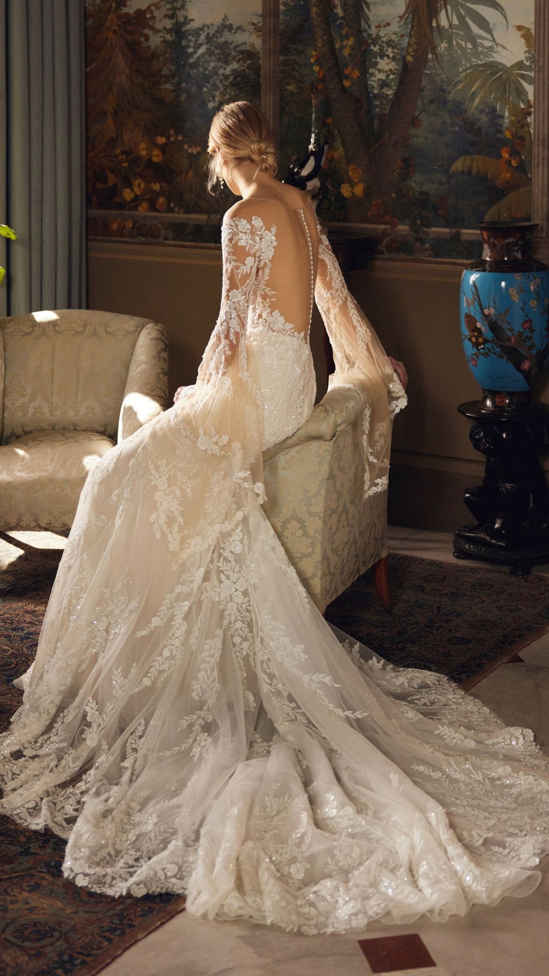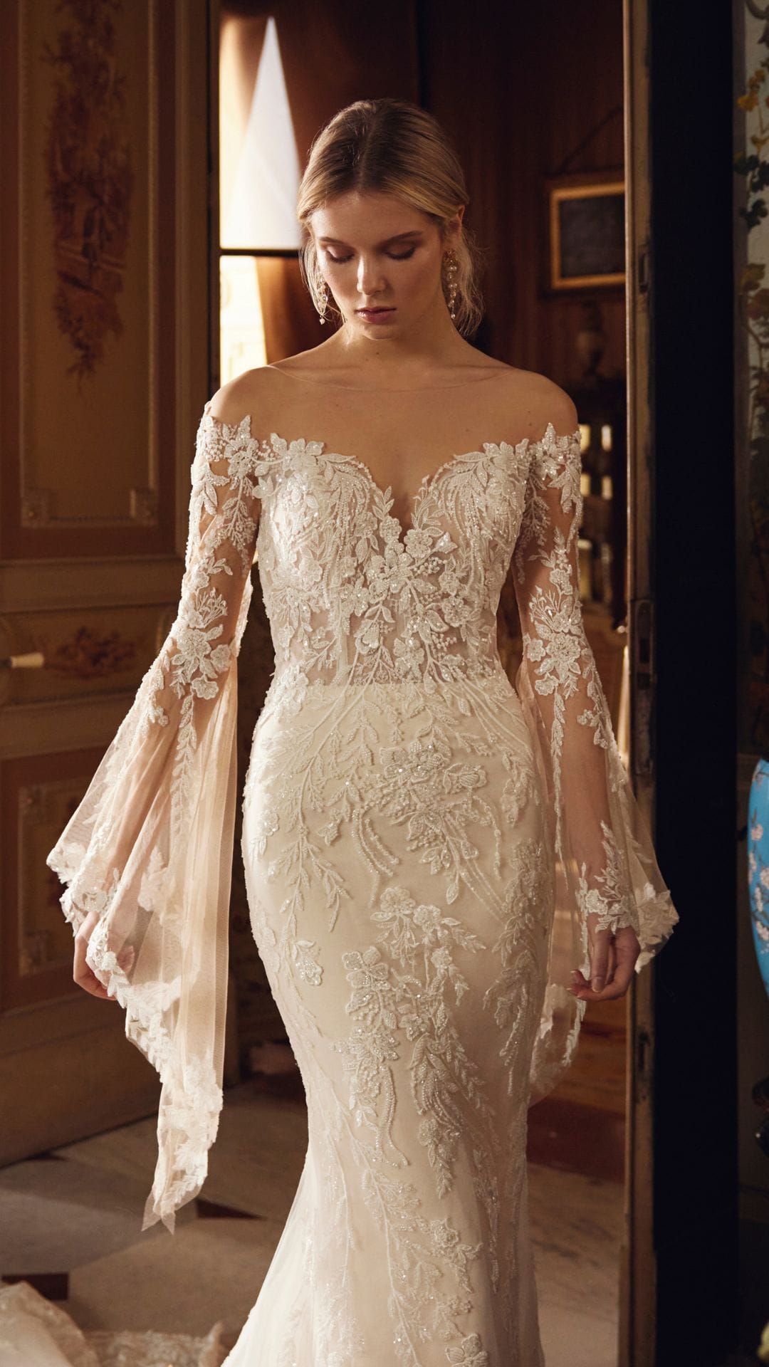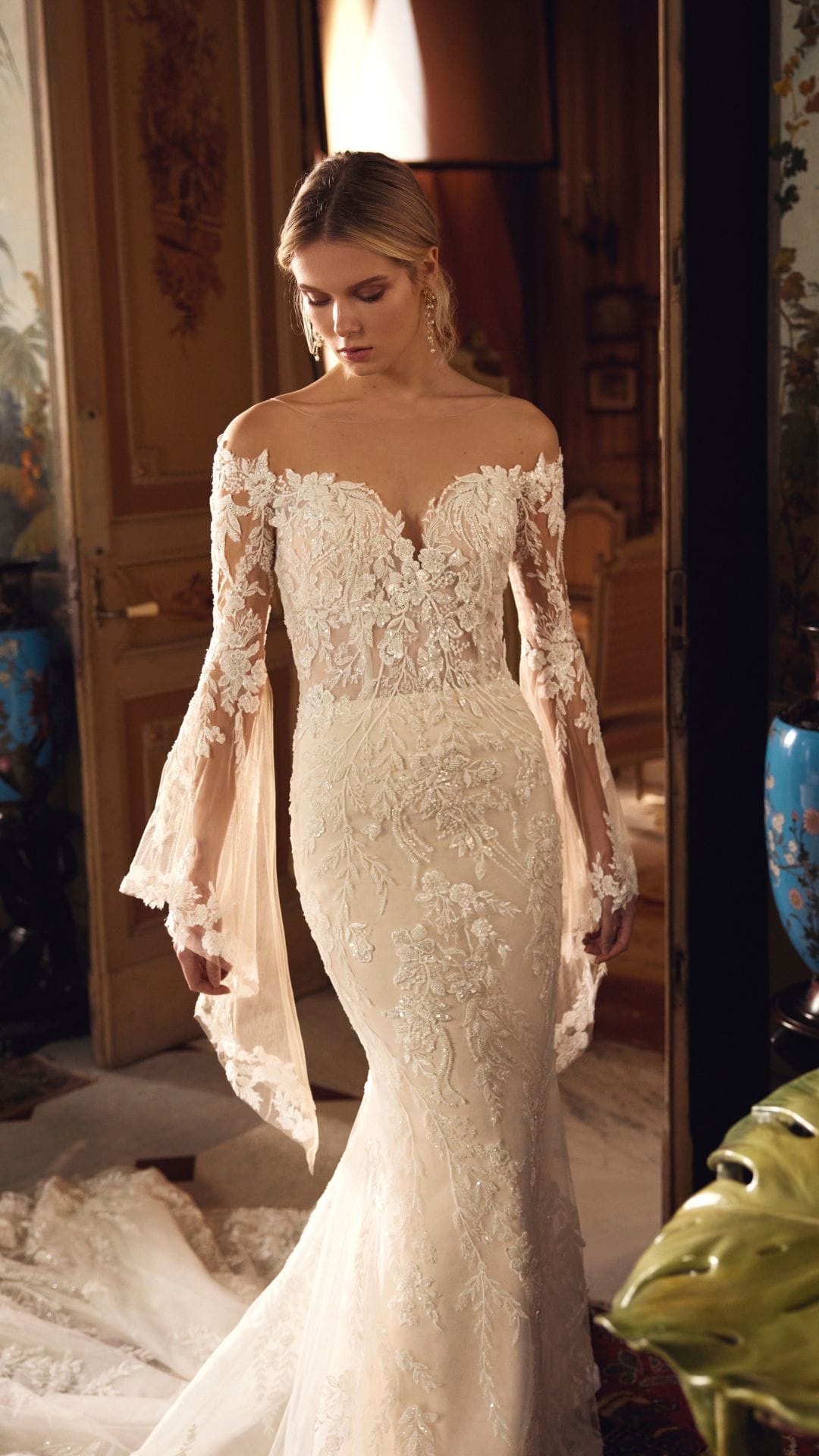 Abito da sposa Demetrios 04: La raffinatezza boho brilla in questo stile da sogno, con maniche a campana fluenti che portano un tocco romantico alla silhouette aderente. Il fascino bohémien dell’abito e il fascino sofisticato sono esaltati da abbellimenti di pizzo con perline, aggiungendo il design lussuoso per esaltarne la bellezza.
