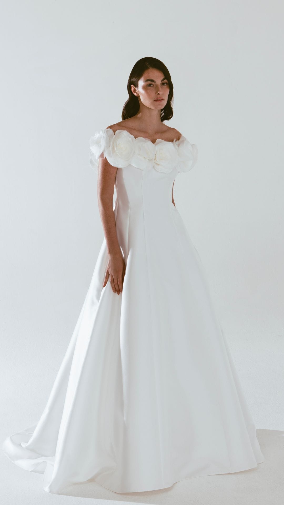 È in mikado e per questo molto luminoso, sulla scollatura a barca sono state applicate delle rose in organza.