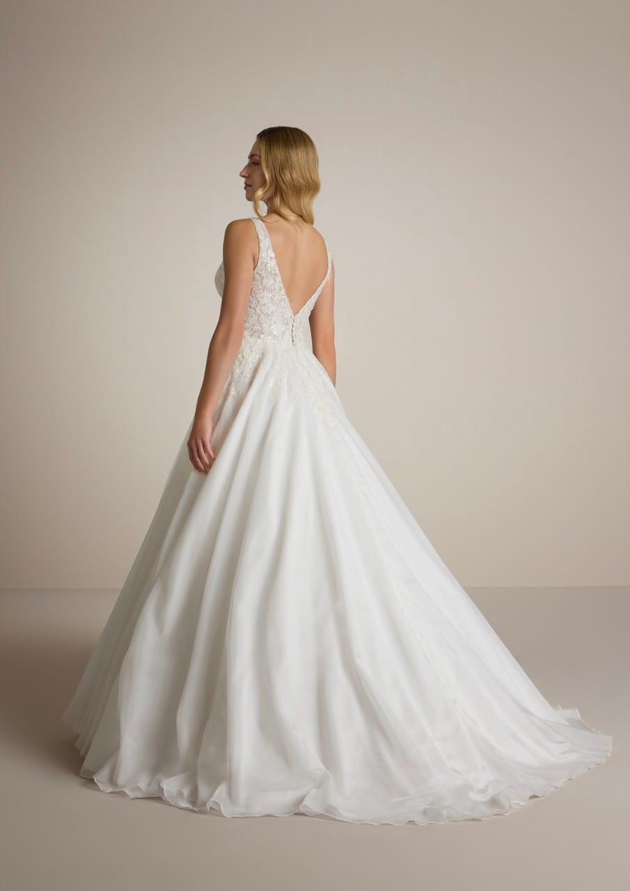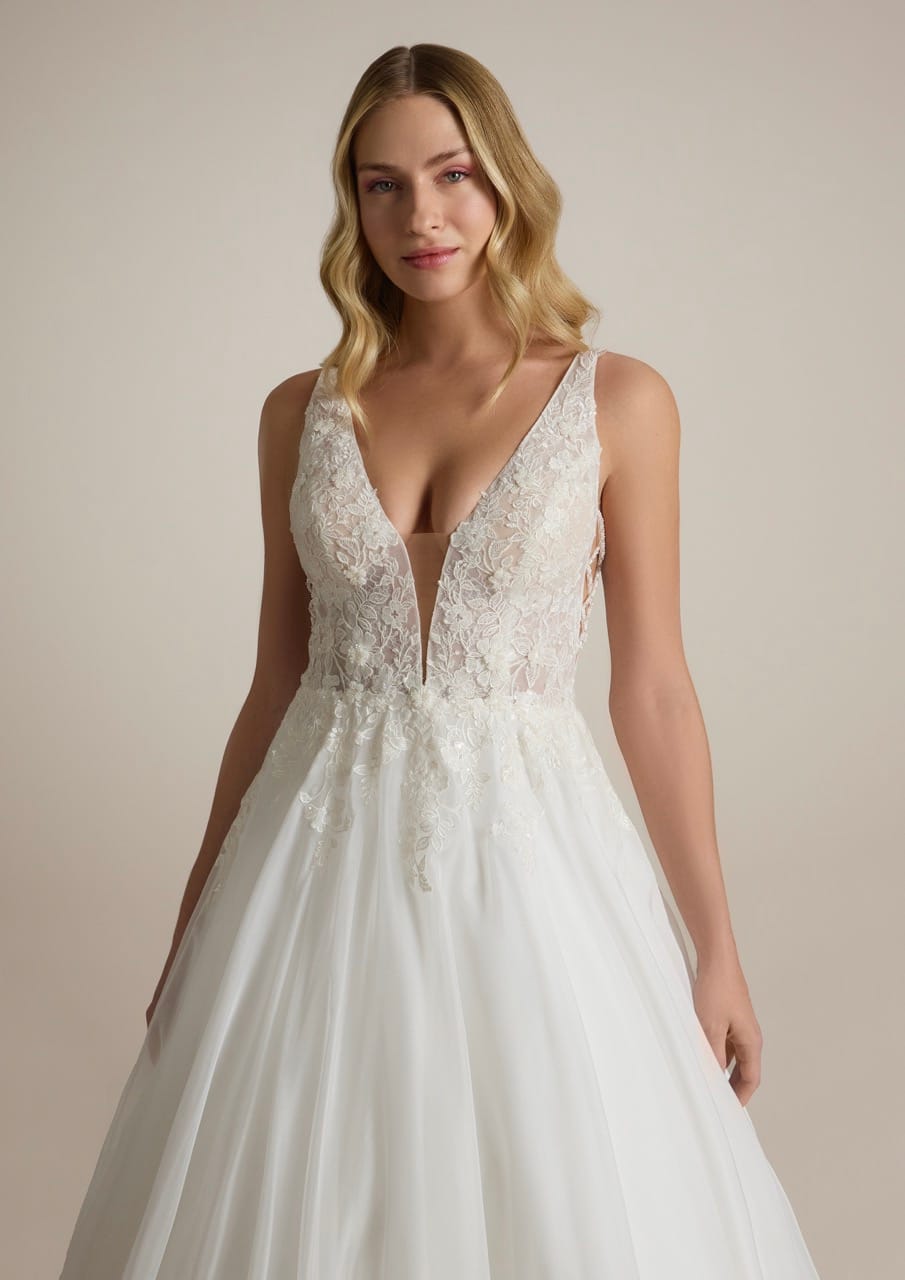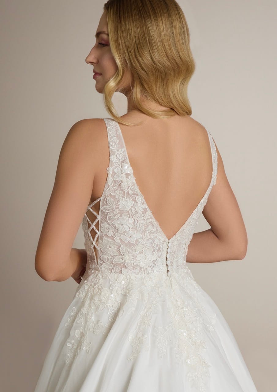 Abito da sposa Ladybird 04: Scegli questo abito da sposa che mostra un corpetto in pizzo e perline con aperture laterali originali che imitano il crossover dei classici corsetti. Vanta una pronunciata scollatura a V sul retro, che culmina in un’elegante chiusura a bottone in vita.
