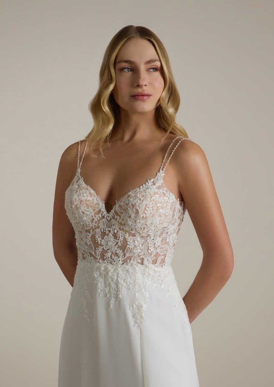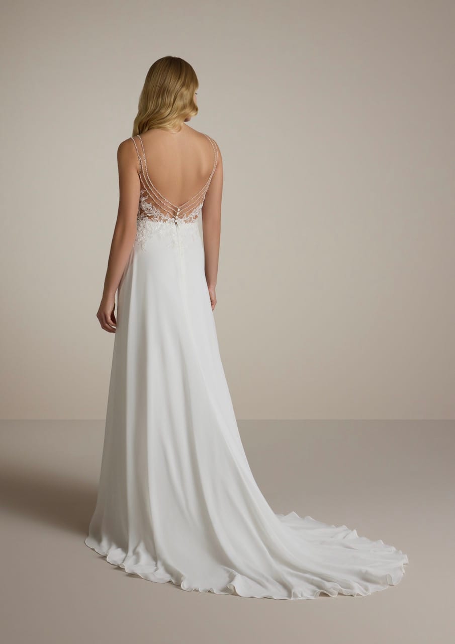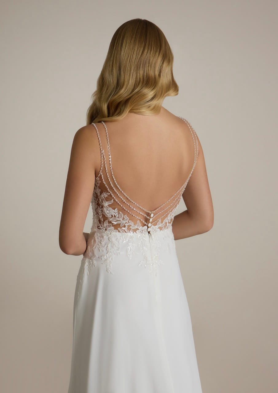 Abito da sposa Ladybird 08: Innamorati di questo abito da sposa modello A-line. Una gonna in chiffon leggero montata in vita con uno spacco frontale e un corpetto adornato con ricami in pizzo di ispirazione artigianale. I cinturini gioiello sono al centro della scena sul retro, incorniciando la scollatura a V in tre file che culminano in una bella chiusura a bottone.