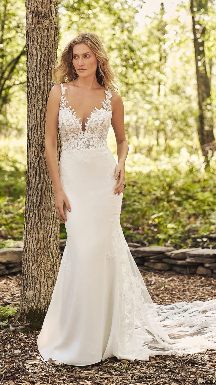 Abito da Sposa Lillian West 10: sensuale abito da sposa modello sirena con top ricamato in pizzo e scollatura a V e coda ricamata.