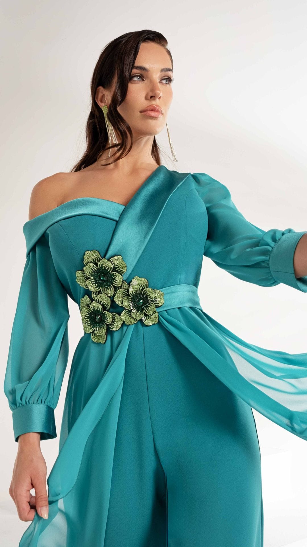 con pantalone lineare, top con scollatura omerale bordo raso; completa il look la spilla floreale abbinata.
